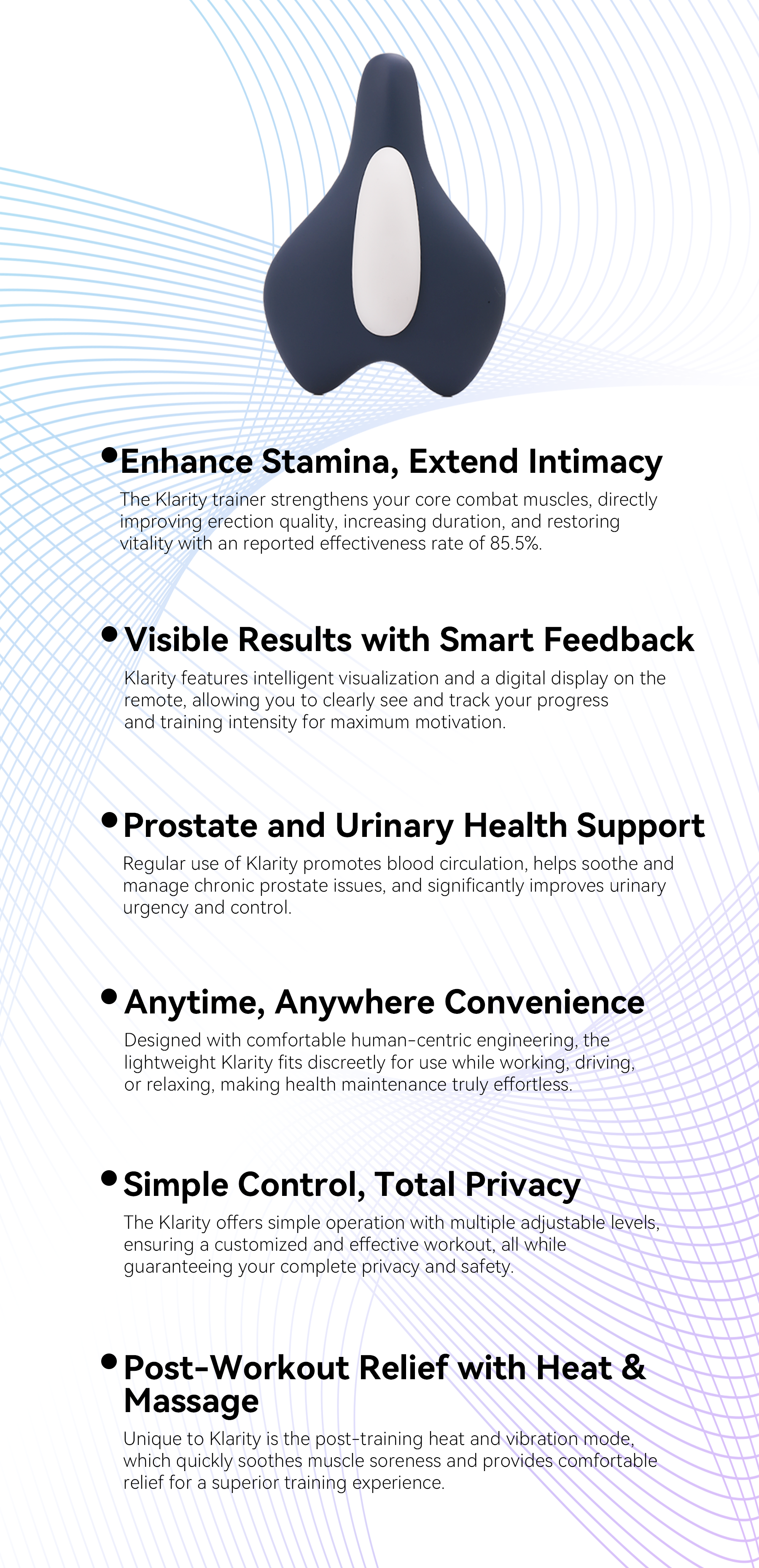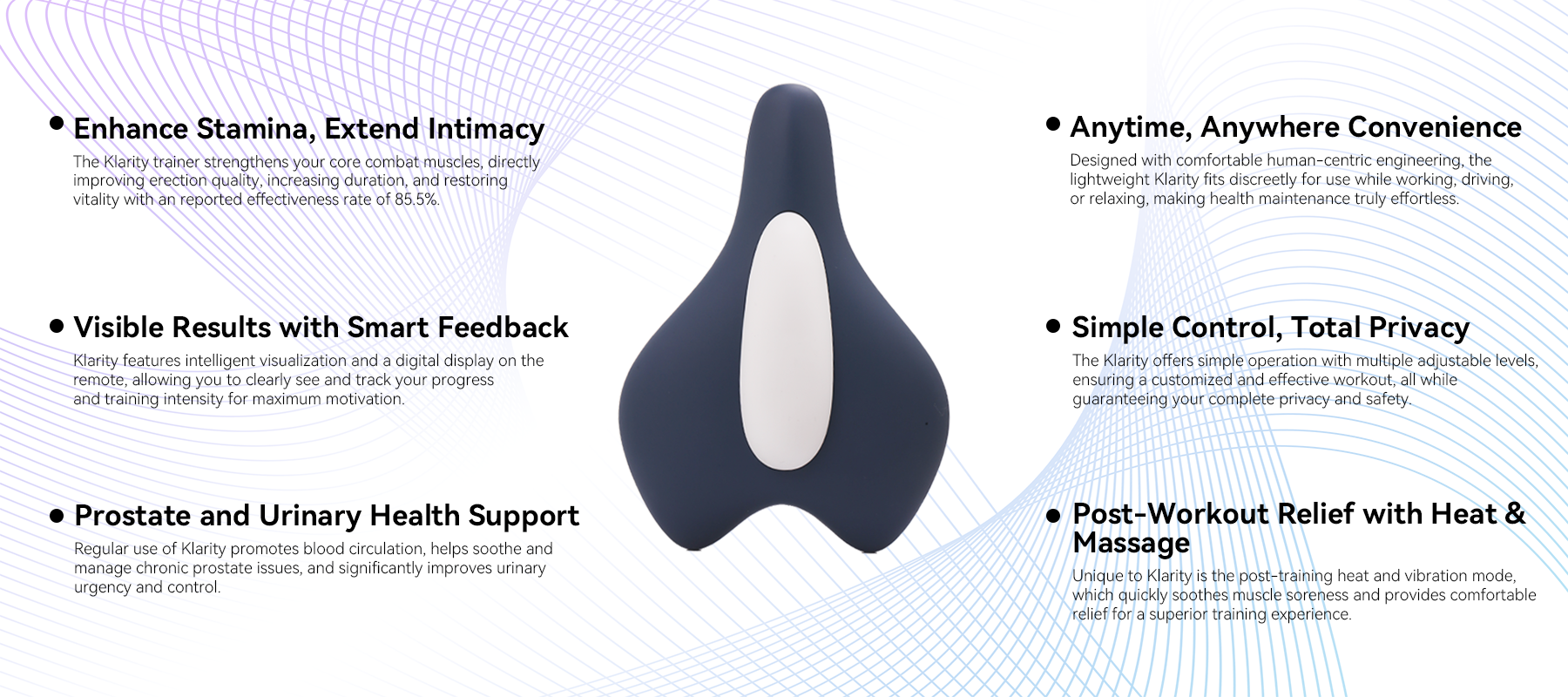 Thus, Klarity was born. The brand uses advanced ergonomics and stable technology to provide effective, comfortable training for improved core strength and prostate health. Klarity’s mission: To help people strengthen their pelvic floor, improve health, and live a more confident, active life.